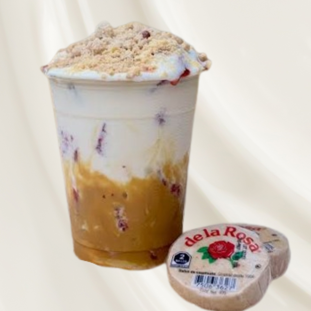 Vaso de 14oz con fresas frescas y crema de la casa, acompañada con rica crema de mazapán y espolvoreada con delicioso mazapán