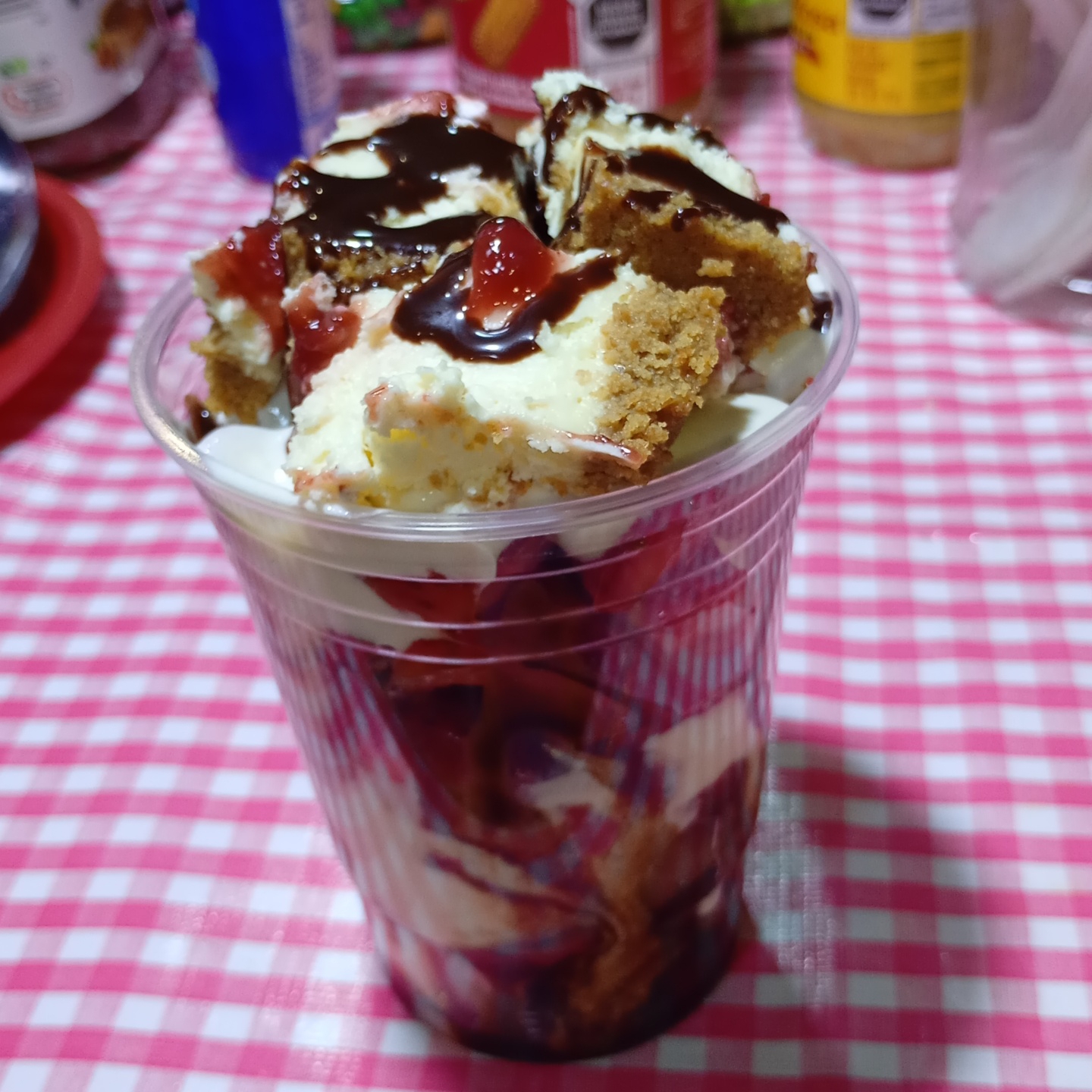 Vaso de 14oz con fresas, crema especial, shot de rompope, toppings a elegir a elegir y waffer de chocolate