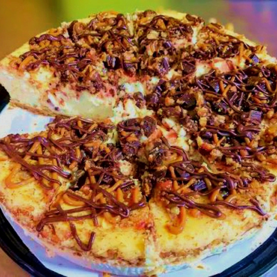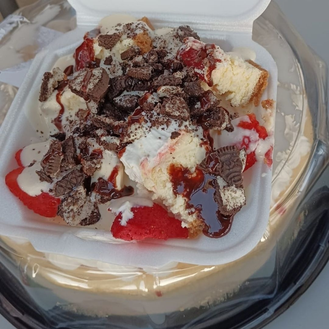 Rebanada de cheesecake de frambuesa o chocolate bañado con nuestra crema especial, fresas toppings y jarabes a elegir y waffer de chocolate