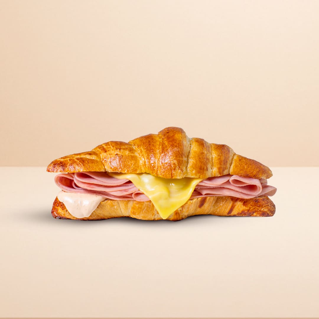 Delicios criossant de pan hojaldre con pechuga de pavo y queso gouda, con un toque de aderezo chipotle.