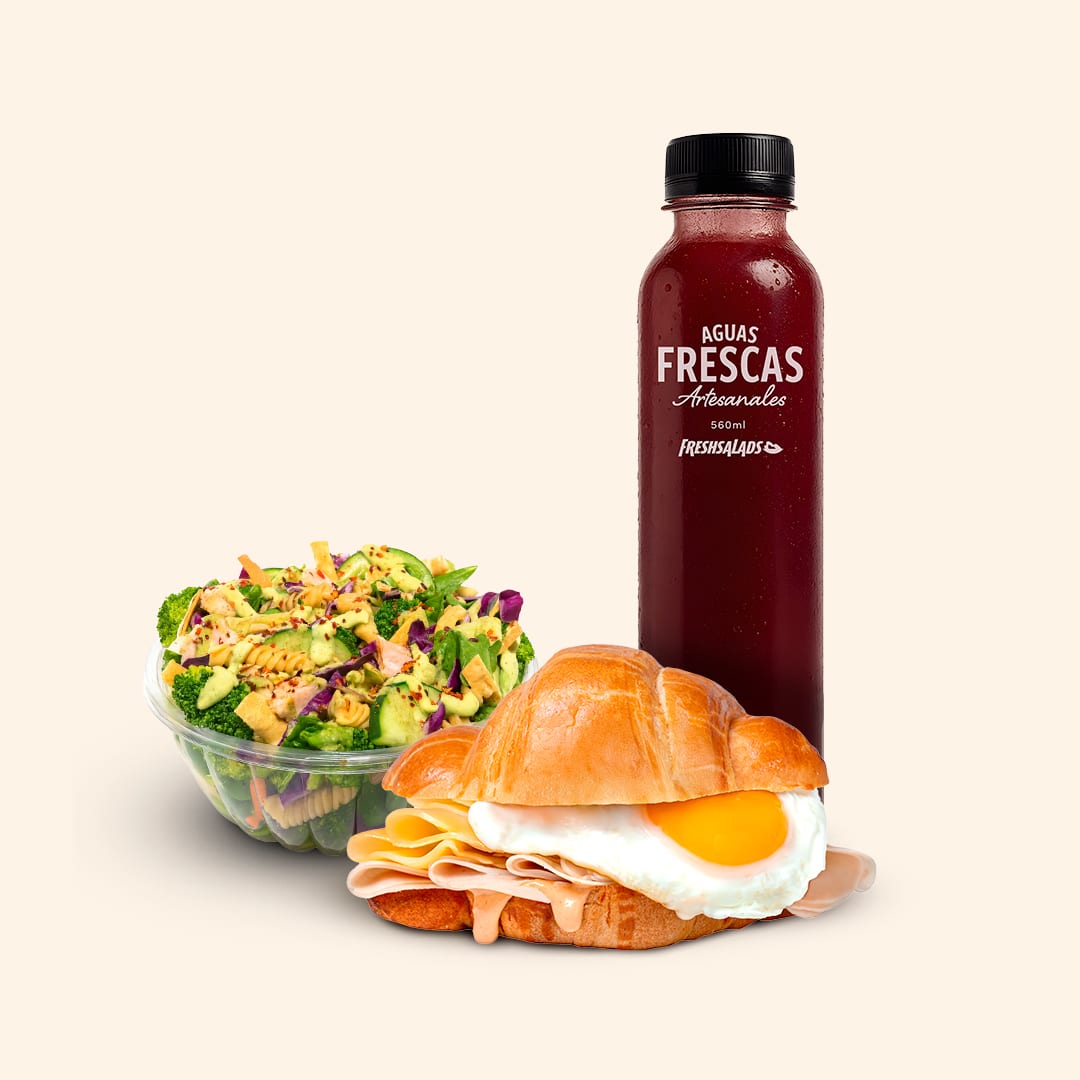 Delicioso criossant de pan hojaldre, pechuga de pavo, huevo, queso gouda, con un toque de aderezo chipotle, acompañado de una ensalada mini y una bebida.