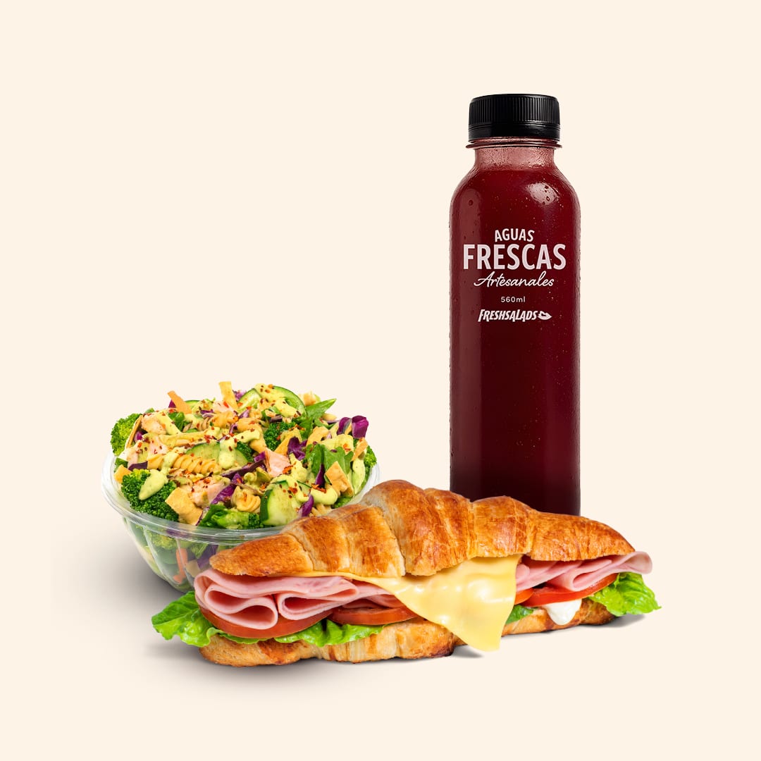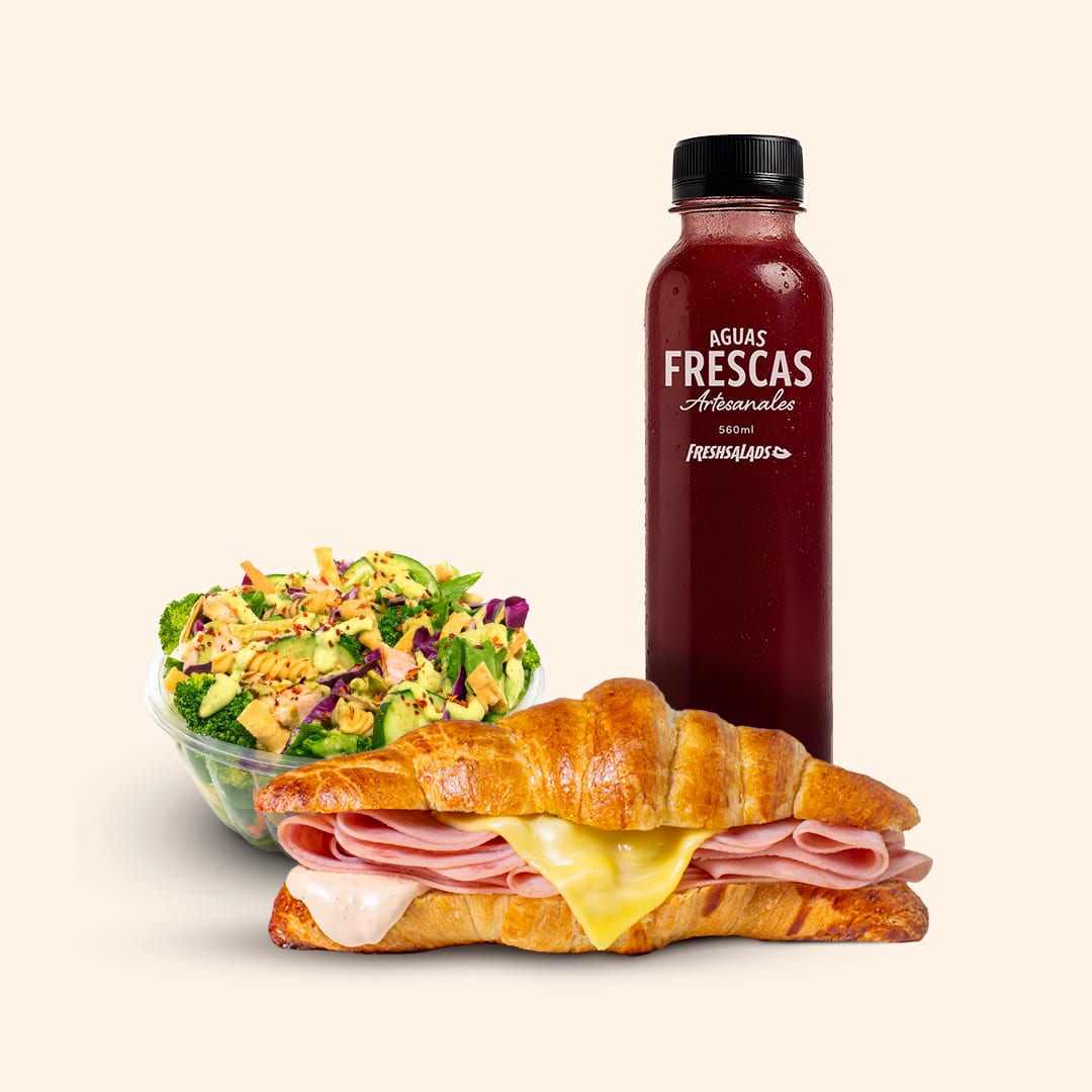Delicios criossant de pan hojaldre con pechuga de pavo y queso gouda, con un toque de aderezo chipotle, acompañado de una ensalada mini y una bebida.