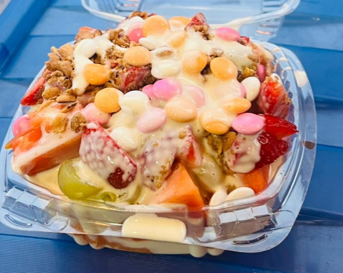 Fruta picada cubierta con una deliciosa crema dulce y toppings.