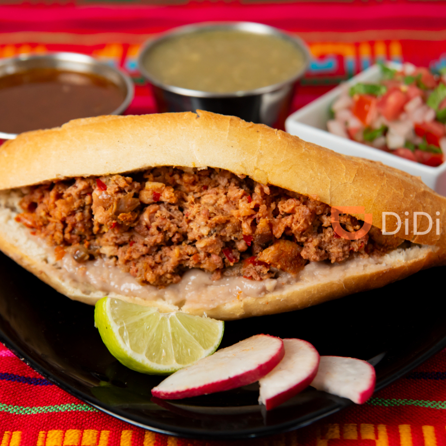 barbacoa en pan de la casa calientito con mantequilla, frijolitos, verdurita y salsa picante aparte