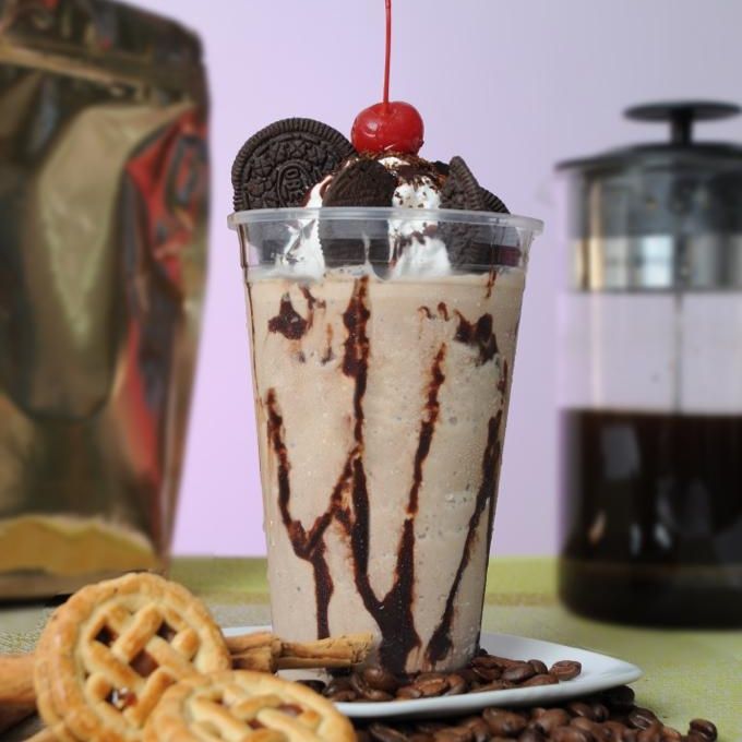 Bebida fría elaborada de Helado Artesanal de Moka con decoración de Chantilly, Cereza, Chocolate y Galleta. Tamaño 14 oz.