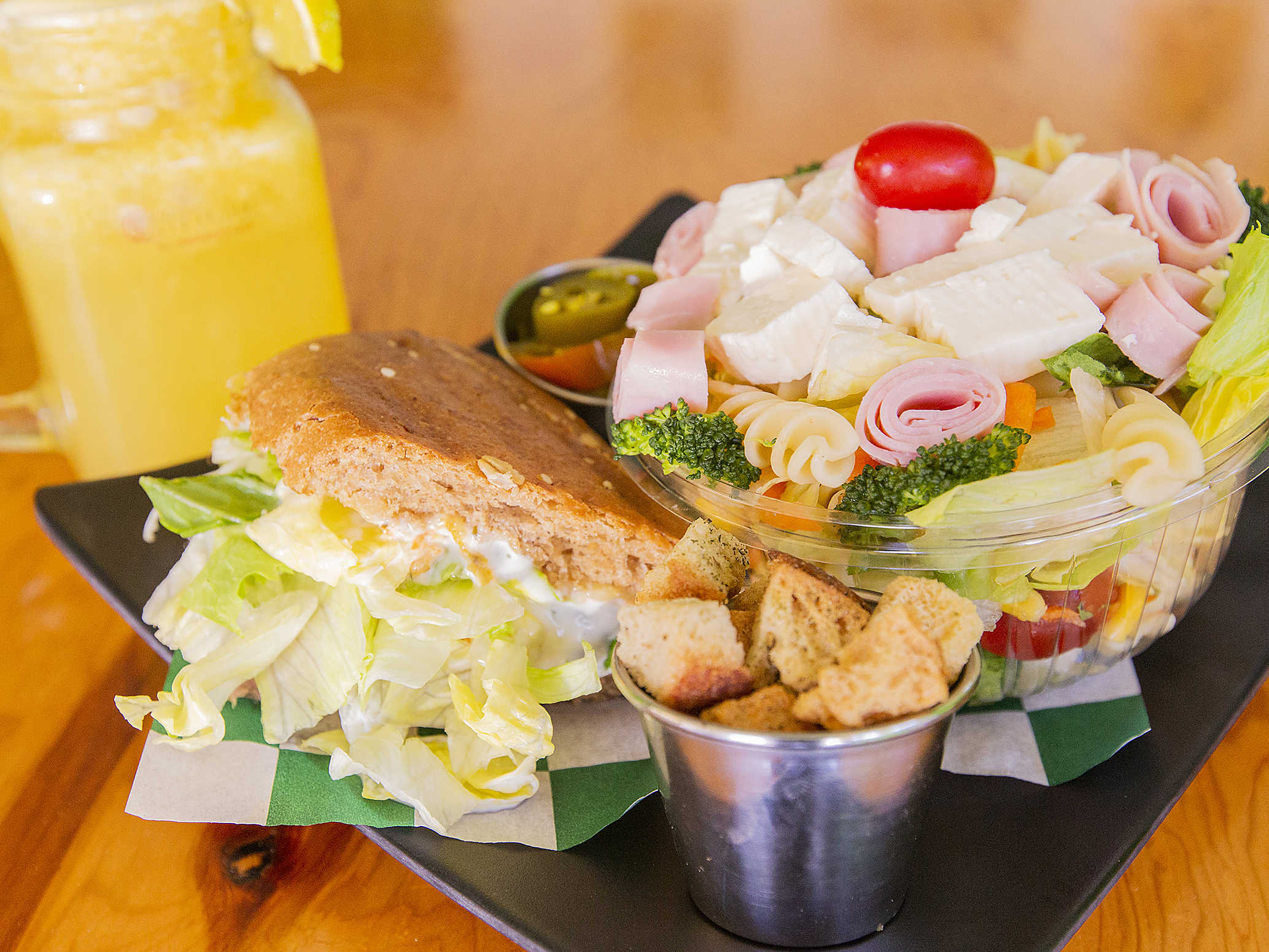 Mozzarela, Pollo, Queso amarillo, Acompañado de ensalada.