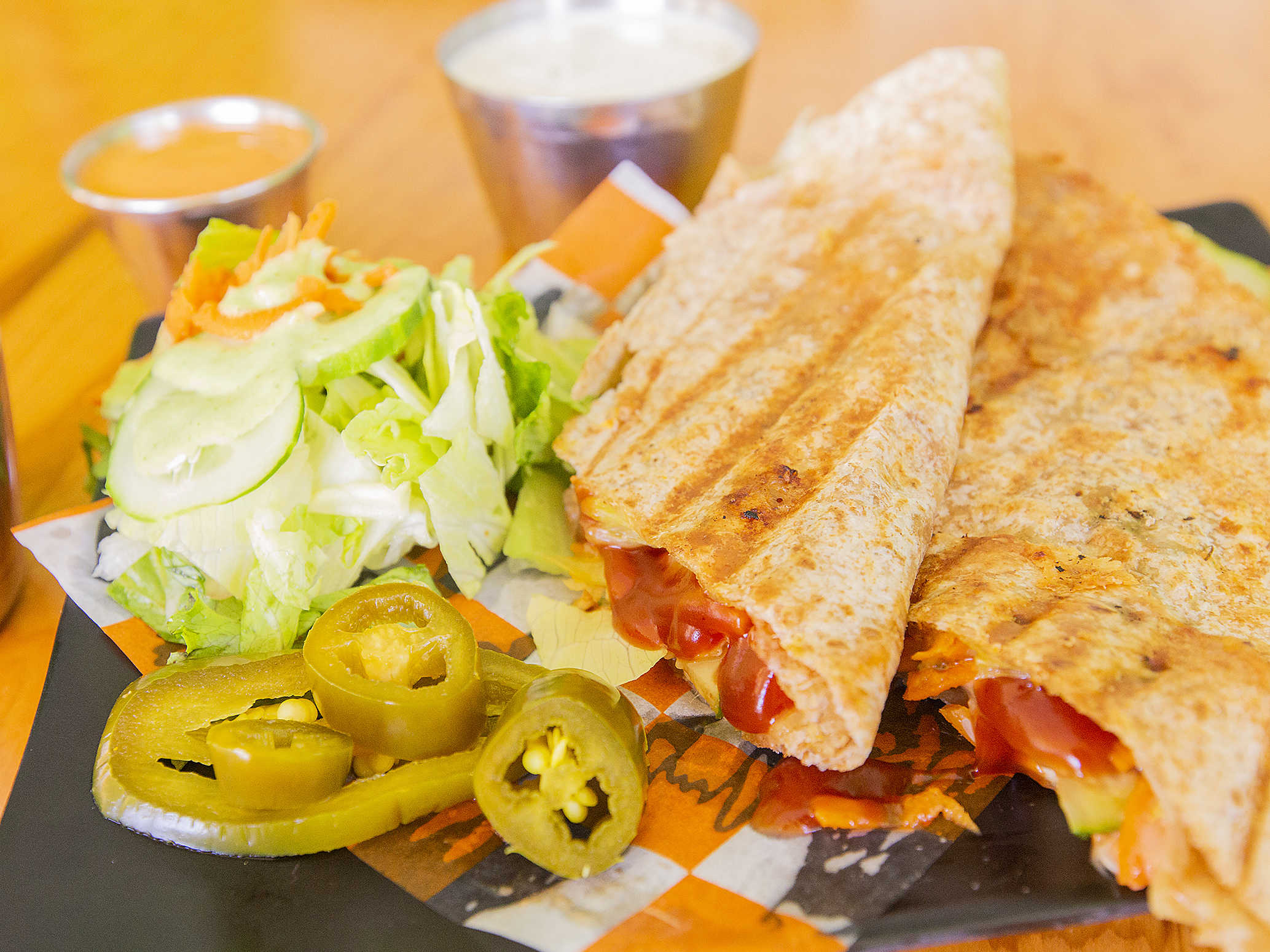 Burrito De Harina Integral con Proteína, Queso gratinado, Zanahoria, Cebolla, Pepino, Lechuga y Aderezo, Cocinado al Grill. Delicioso!