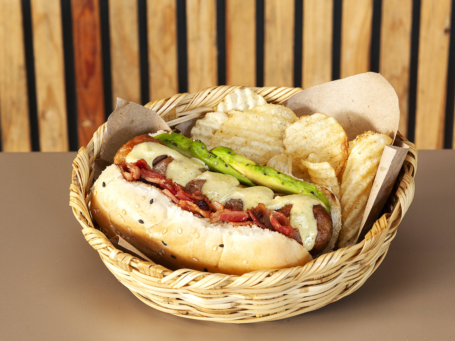 Pan natural, salchicha bratwürst, aguacate, tocino, y mayonesa de jalapeño. acompañado de papitas crujientes