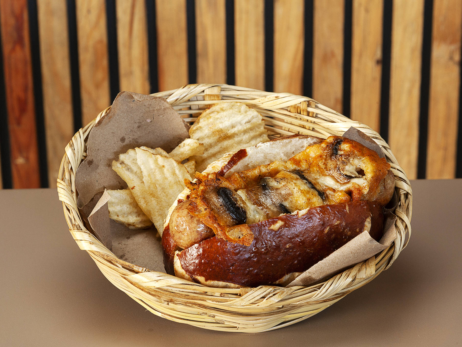 Pan pretzel , salchicha bratwürst, champiñones a la plancha y gouda crujiente.