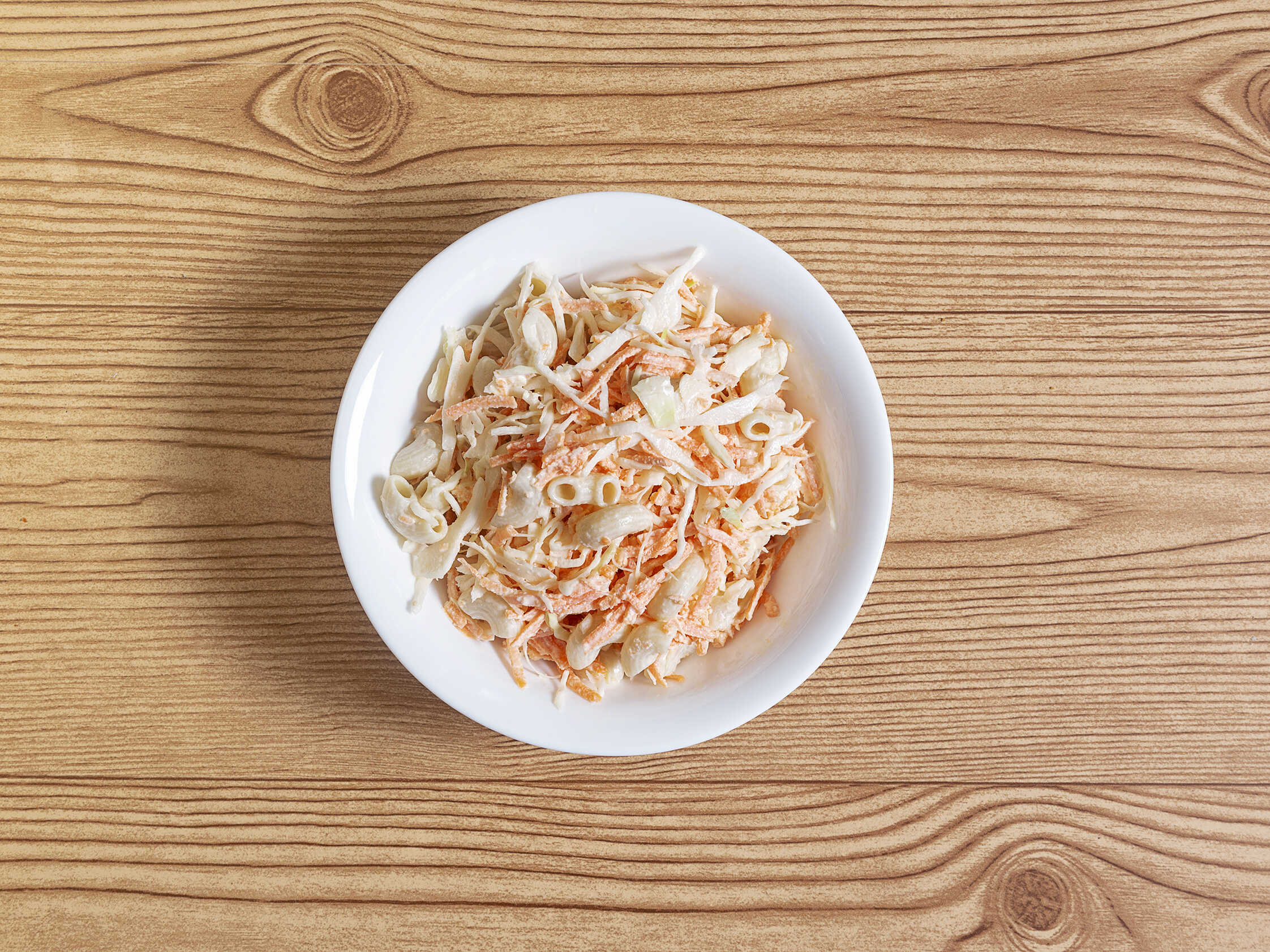 Col fresco acompañado de zanahoria rallada coditos y mayoneza