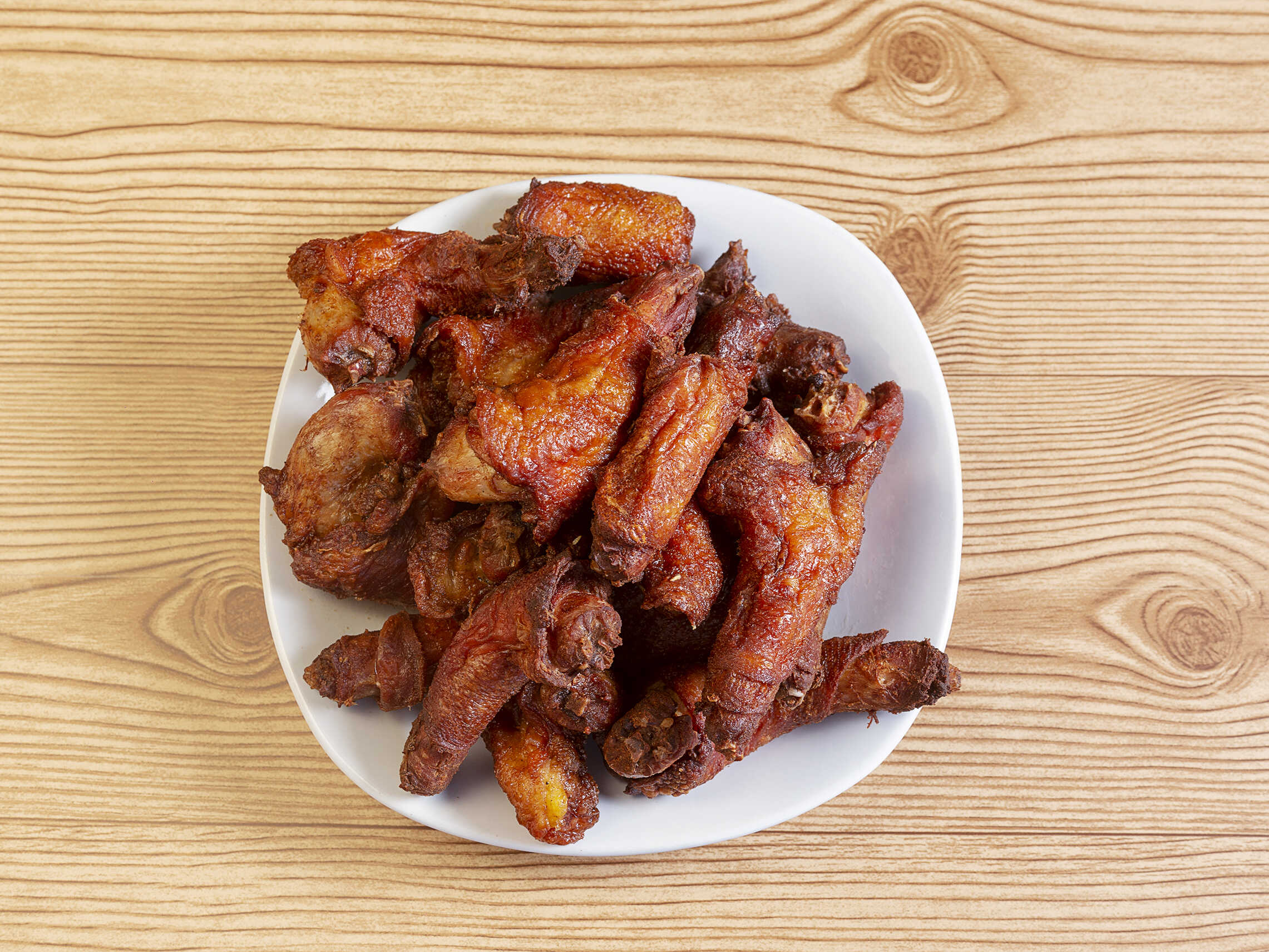 10 piezas de pescuecitos de pollo marinados en especias acompañados con salsa o chile, ensalada y papas rostizadas