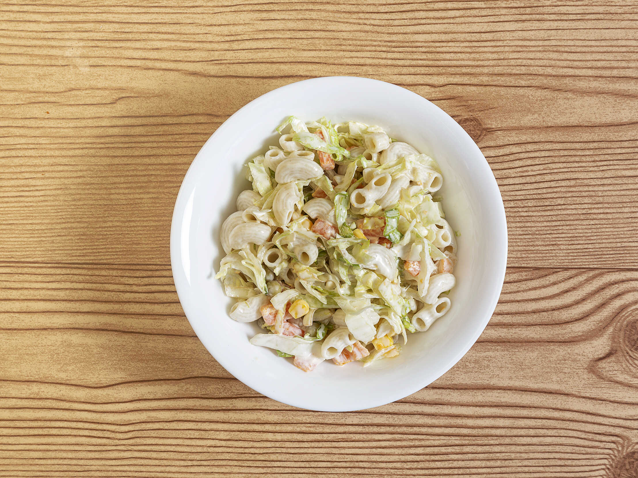 Lechuga fresca acompañada de coditos, chicharo, zanahoria, elote dorado y mayoneza