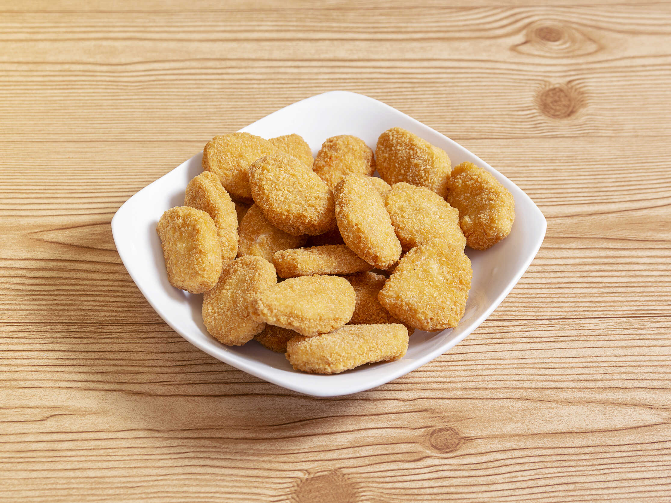 10 piezas de nuggets de pechuga de pollo empanizados acompañados con cátsup y mostaza o aderezo, ensalada y papas rostizadas