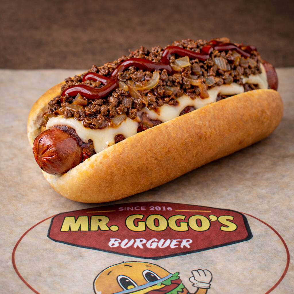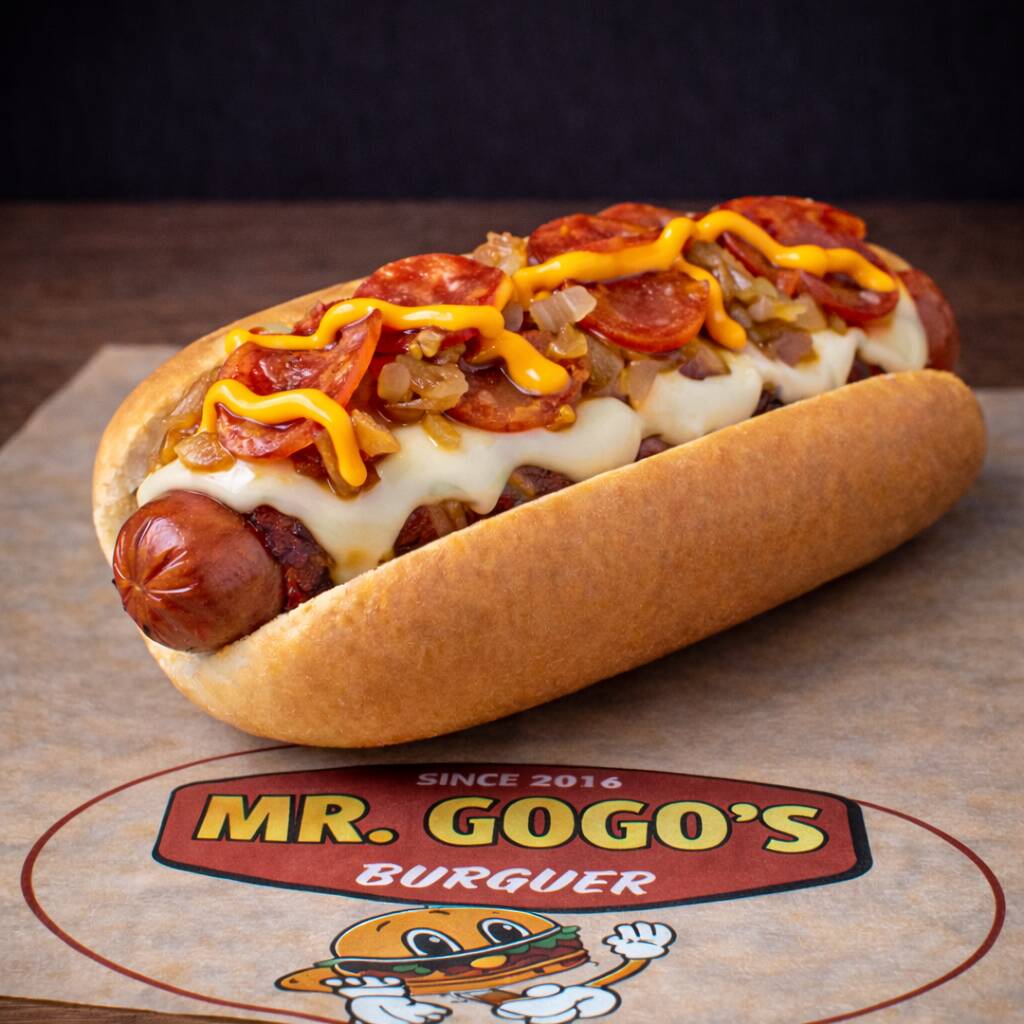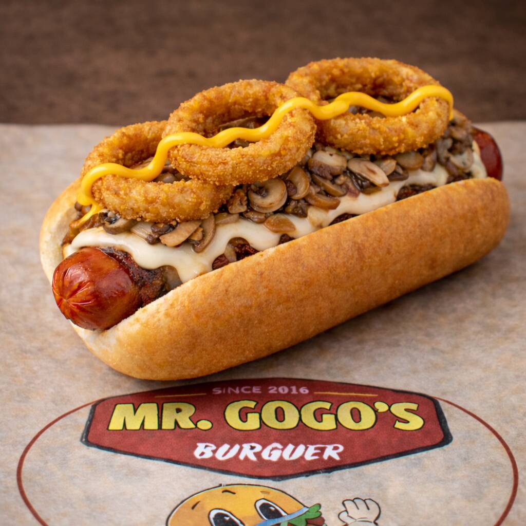 Salchicha de pavo envuelta en crujiente tocino, acompañado de queso asadero derretido, champiñones salteados, aros de cebolla, crema, cátsup y mostaza.