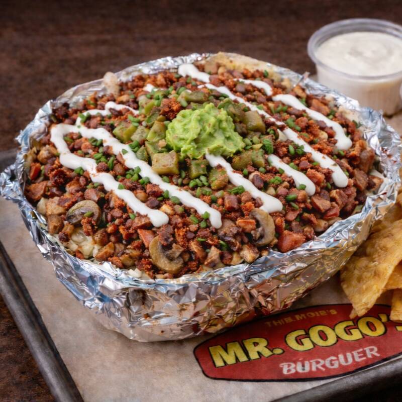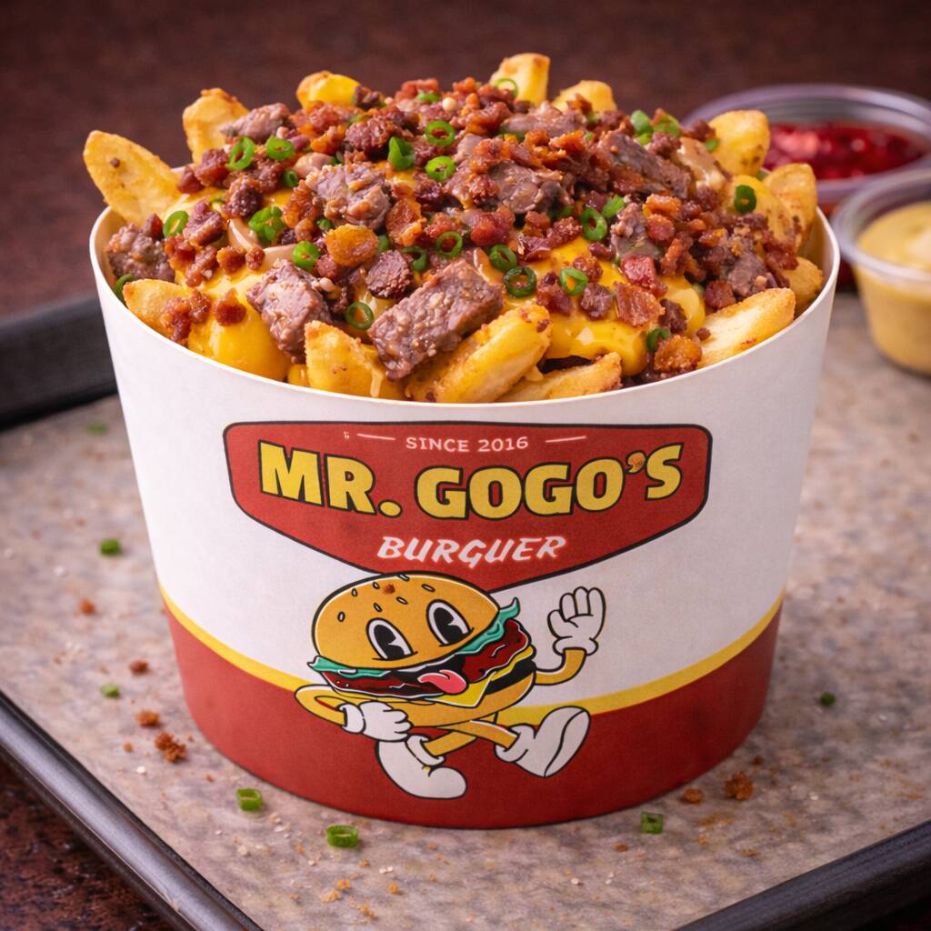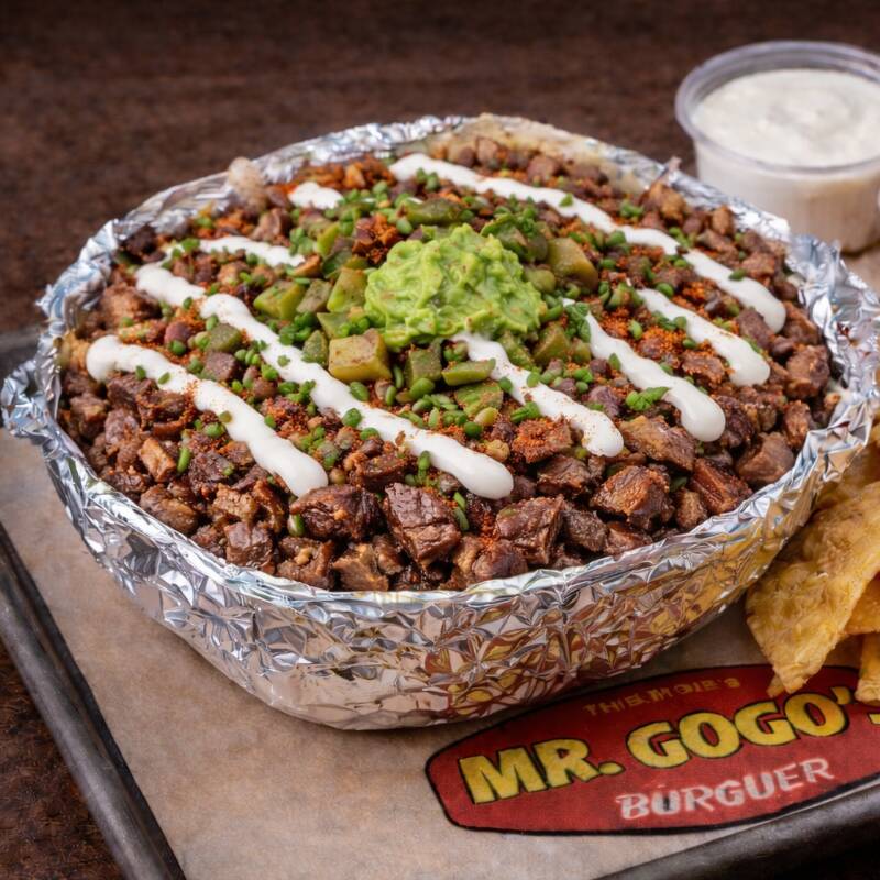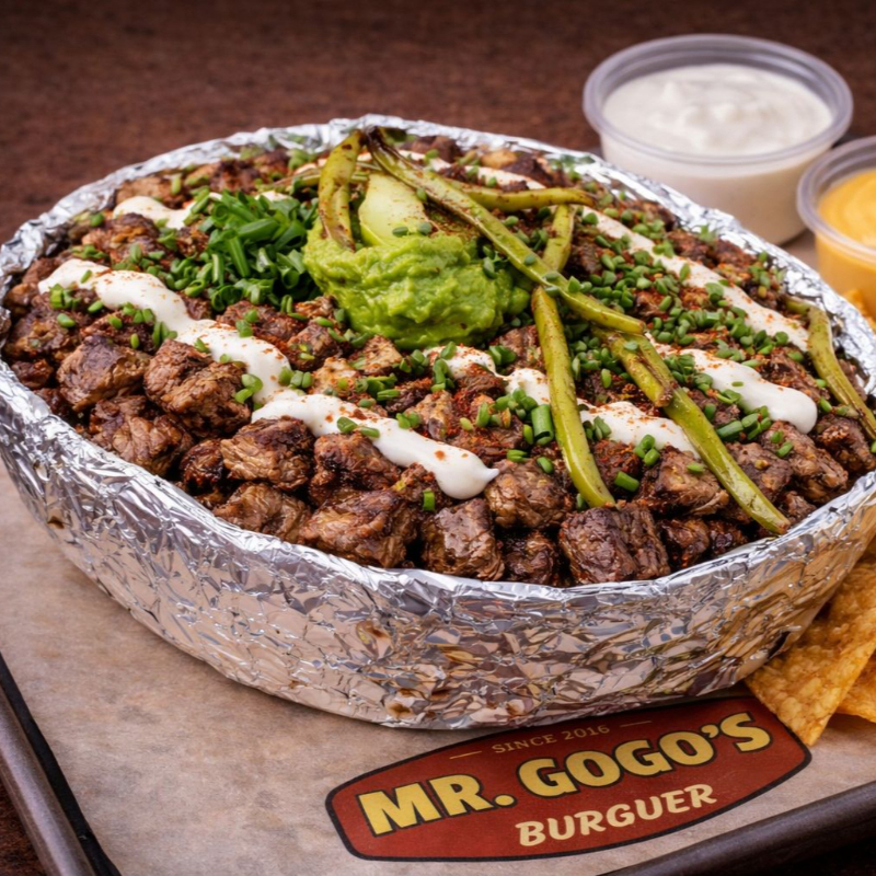 Papas a la francesa bañadas en queso cheddar, arrachera jugosa, tocino crujiente y cebollín fresco.