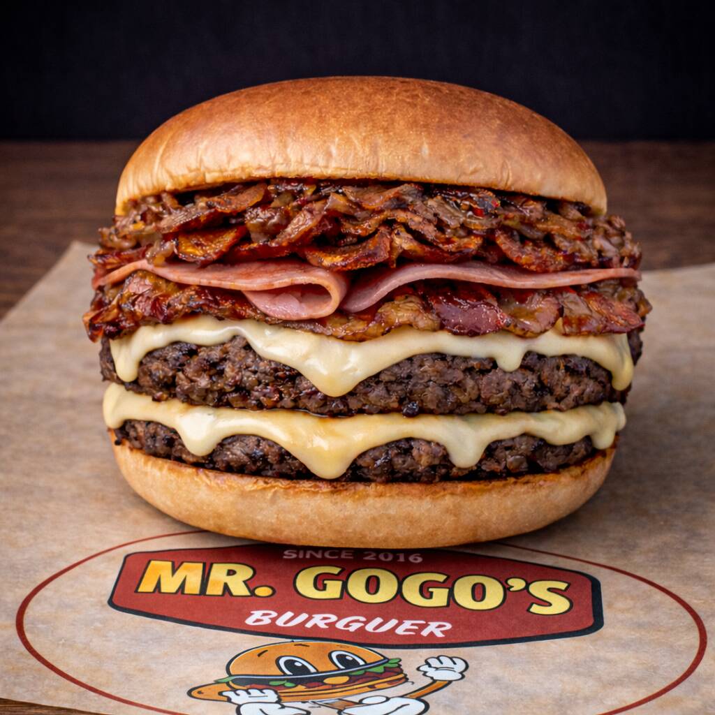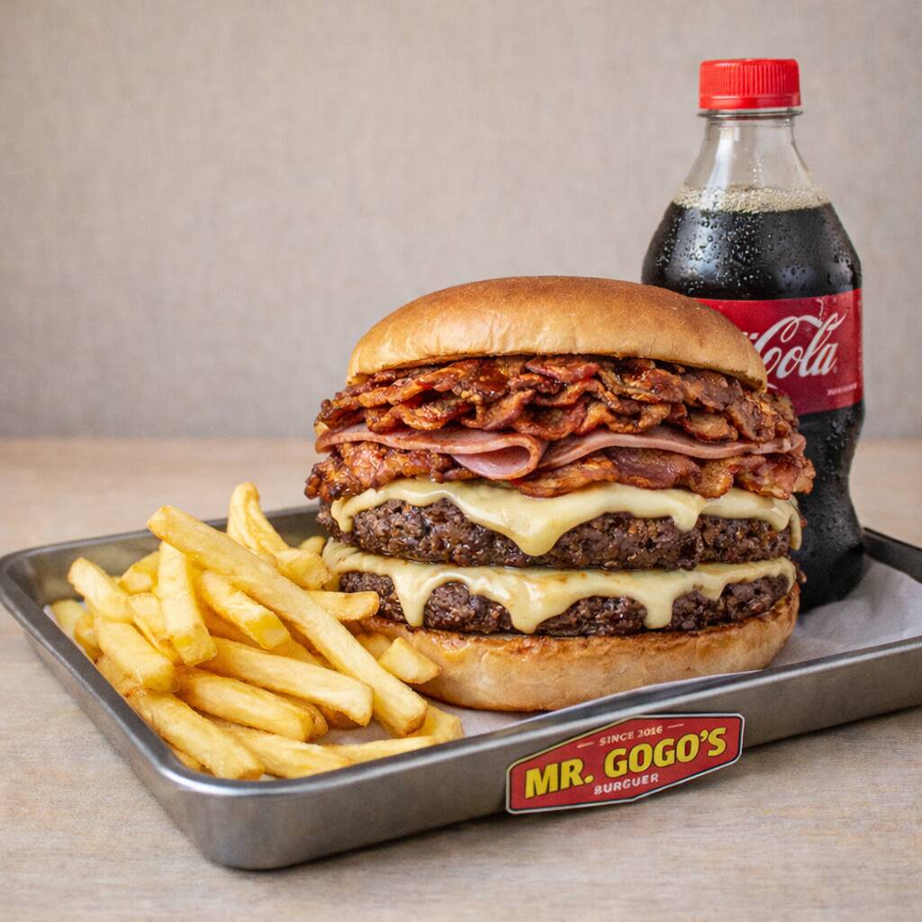 Pan de papa, doble jugosa carne de res de 114 gr, acompañada de doble queso americano derretido, tocino crujiente, jamón, pepperoni, cebolla caramelizada, lechuga y jitomate.