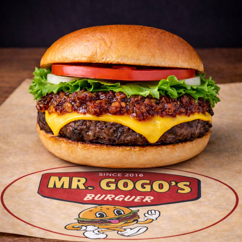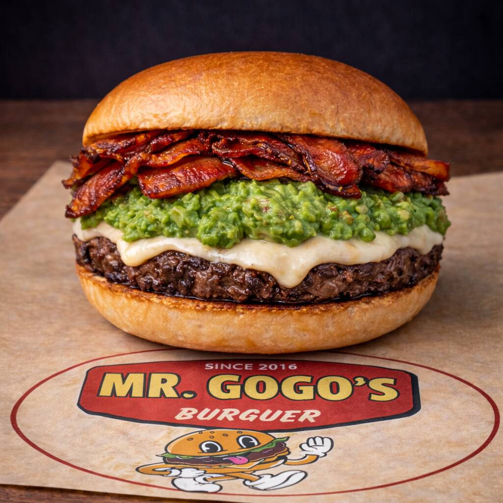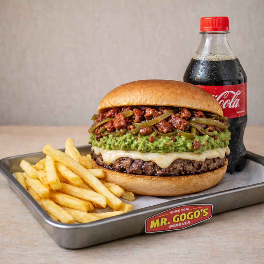 Pan de papa, jugosa carne de res de 114 g, acompañada de queso asadero derretido, guacamole cremoso, chorizo dorado, cebolla caramelizada, chile güero guisado, lechuga y jitomate.