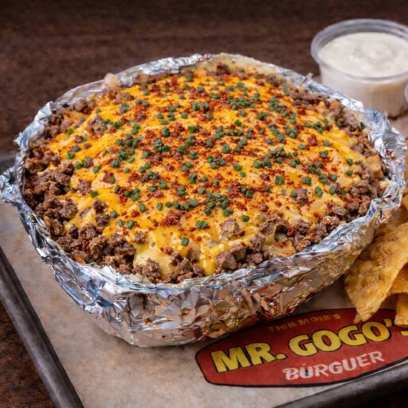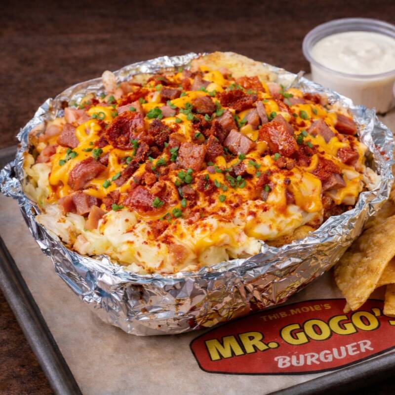 Papa cocida al carbón, sazonada con nuestra mezcla especial de especias, acompañada de mantequilla, crema, queso, 228 g de carne de hamburguesa y queso cheddar derretido. Como toppings: paprika, cebollín fresco, y guacamole.