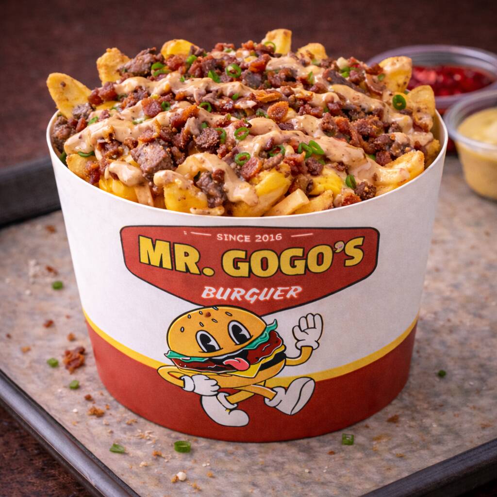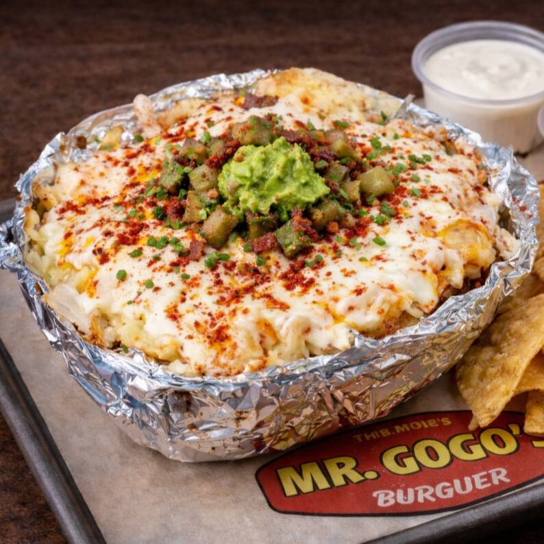 Papas a la francesa bañadas en queso cheddar derretido, carne de hamburguesa, tocino, cebolla guisada y aderezo Big Mac.