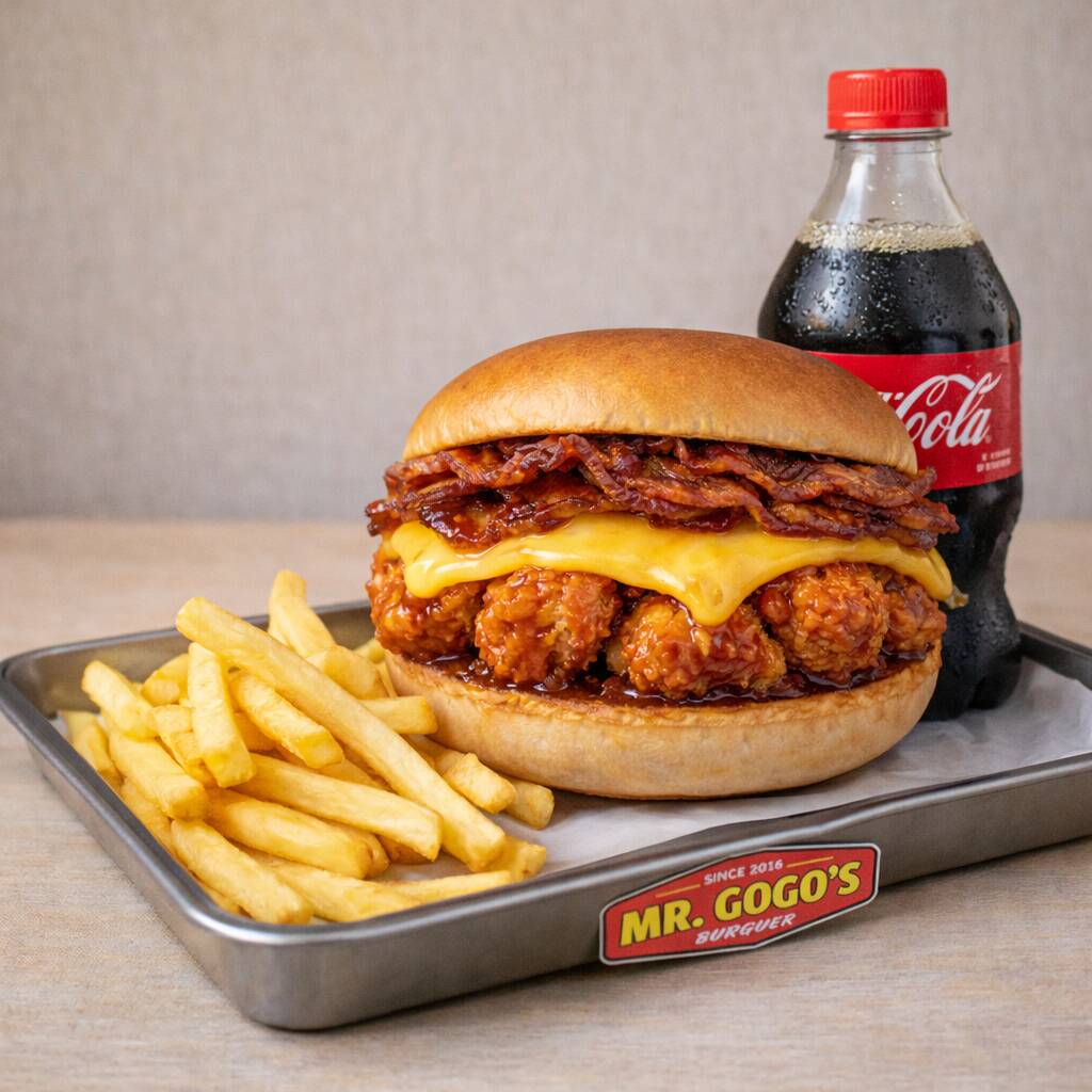Pan de papa, crujientes tiras de pollo tipo tender, acompañadas de queso americano derretido, tocino crujiente, lechuga, jitomate y cebolla.