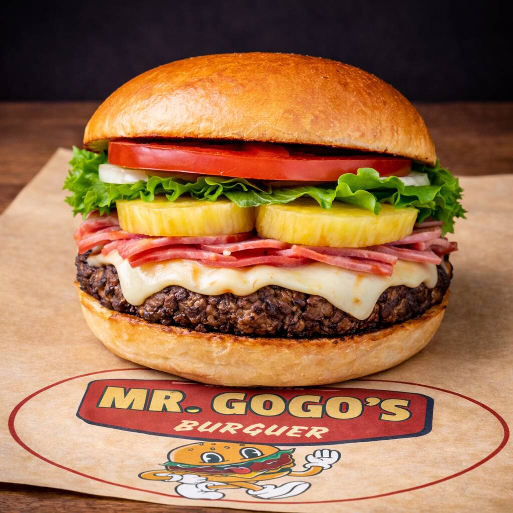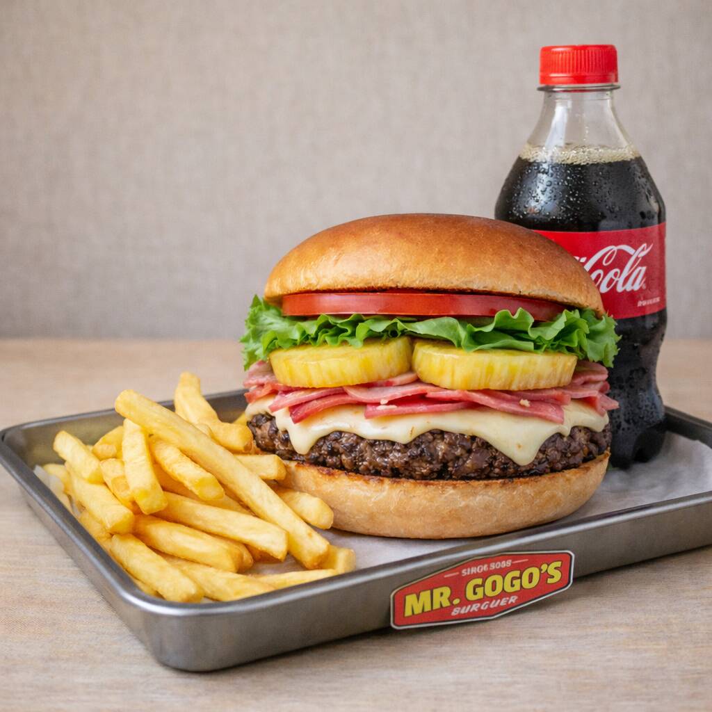 Pan de papa, jugosa carne de res de 114 g, acompañada de queso asadero derretido, piña asada, jamón, lechuga, jitomate y cebolla.