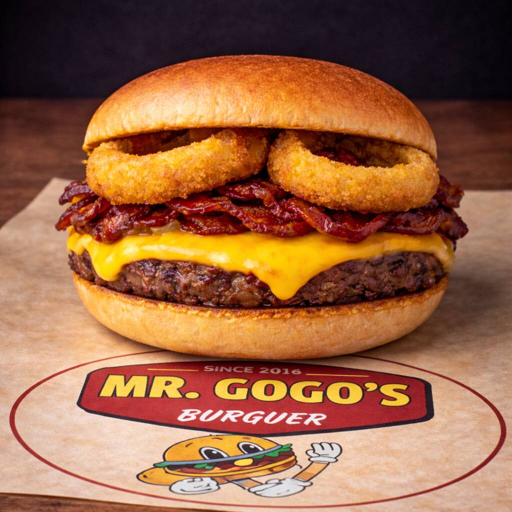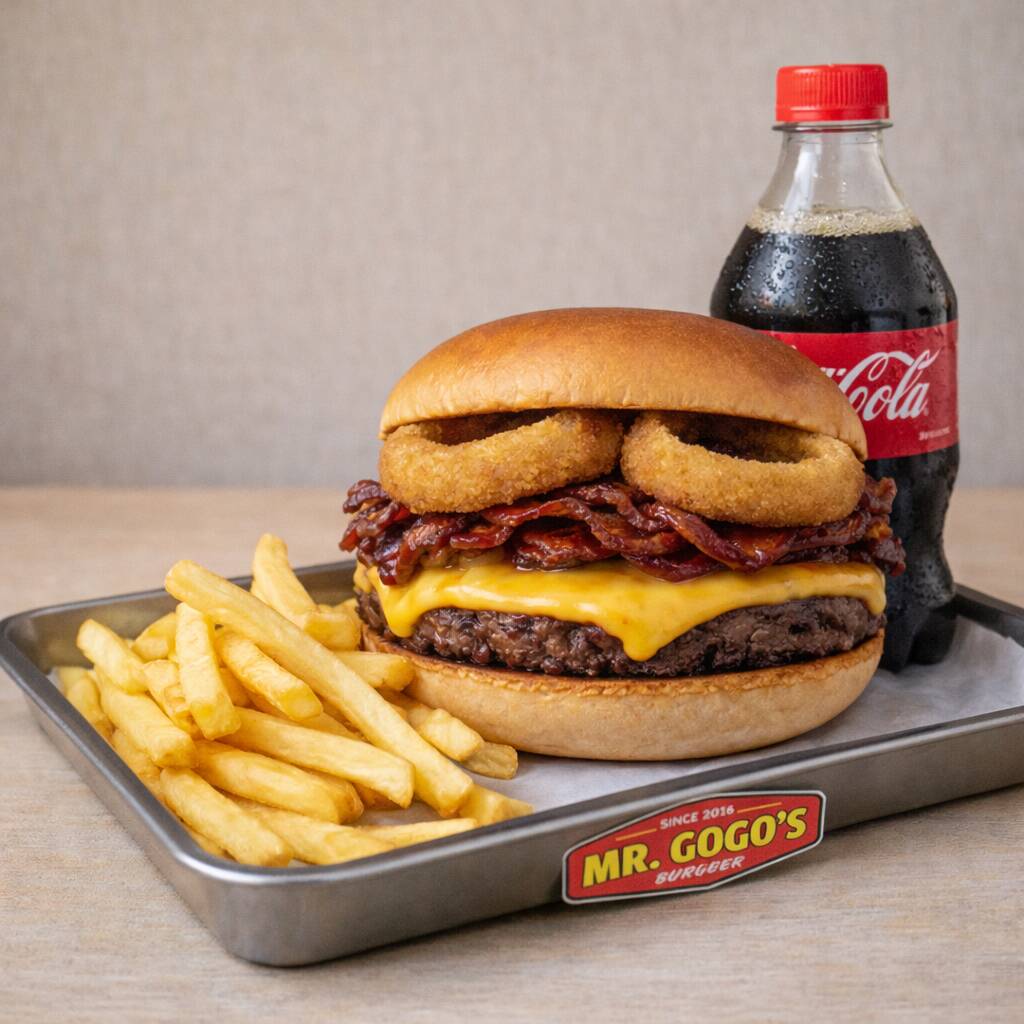 Pan de papa, jugosa carne de res de 114 g, acompañada de queso americano derretido, tocino crujiente, aros de cebolla, lechuga, jitomate y cebolla.