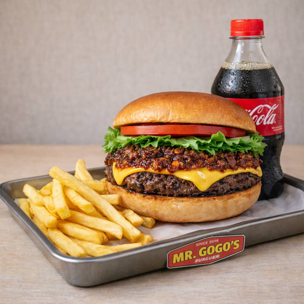 Pan de papa, jugosa carne de res de 114 g, acompañada de queso asadero derretido, mermelada de tocino artesanal, lechuga y jitomate.