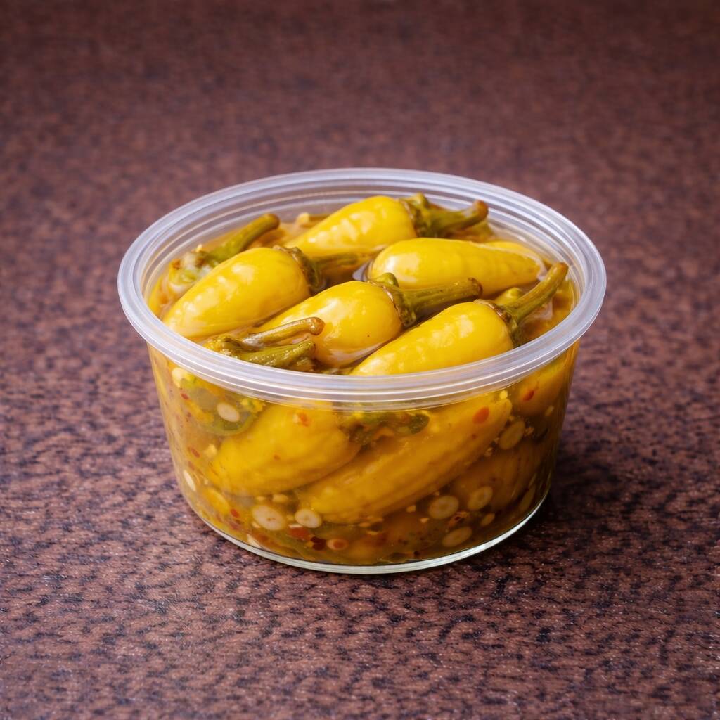 Chiles güeros enteros en escabeche. Su sabor es ligeramente picante con un toque ácido. Perfectos para acompañar cualquier hamburguesa o hot dog.