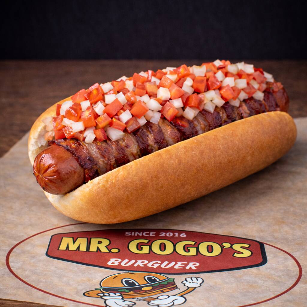 Salchicha de pavo envuelta en crujiente tocino, acompañado de jitomate y cebolla picada.
