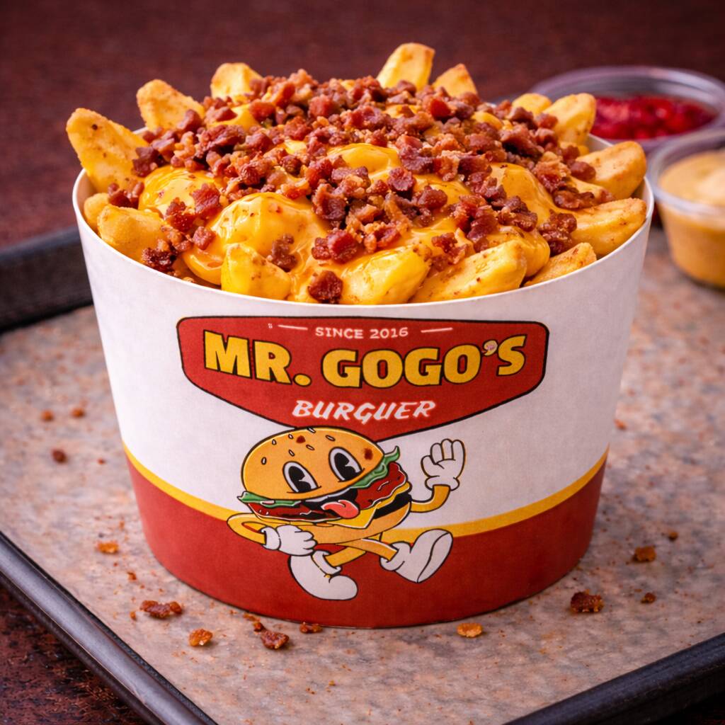 Papas a la francesa bañadas en queso cheddar derretido y tocino crujiente.