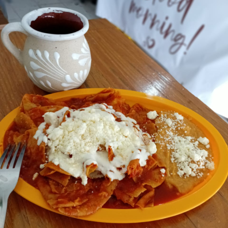 Totopos de tortilla de maíz fritos, bañados en salsa roja de chile de teñir, se acompañan con crema, queso, cebolla y frijoles.