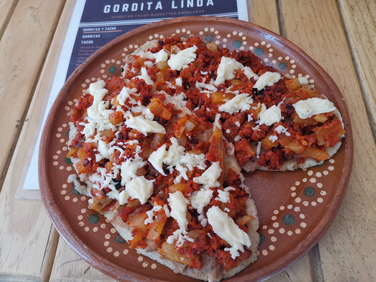 Gordita grande , con base de frijoles fritos , con hasta 4 ingredientes a tu eleccion mas queso fundido