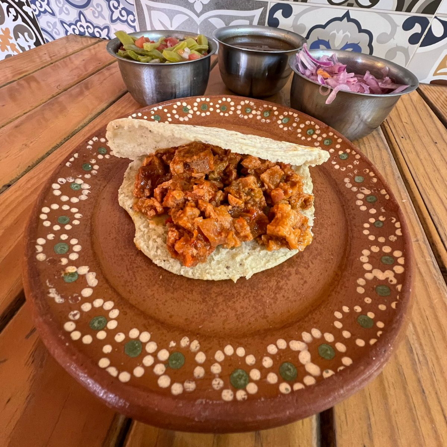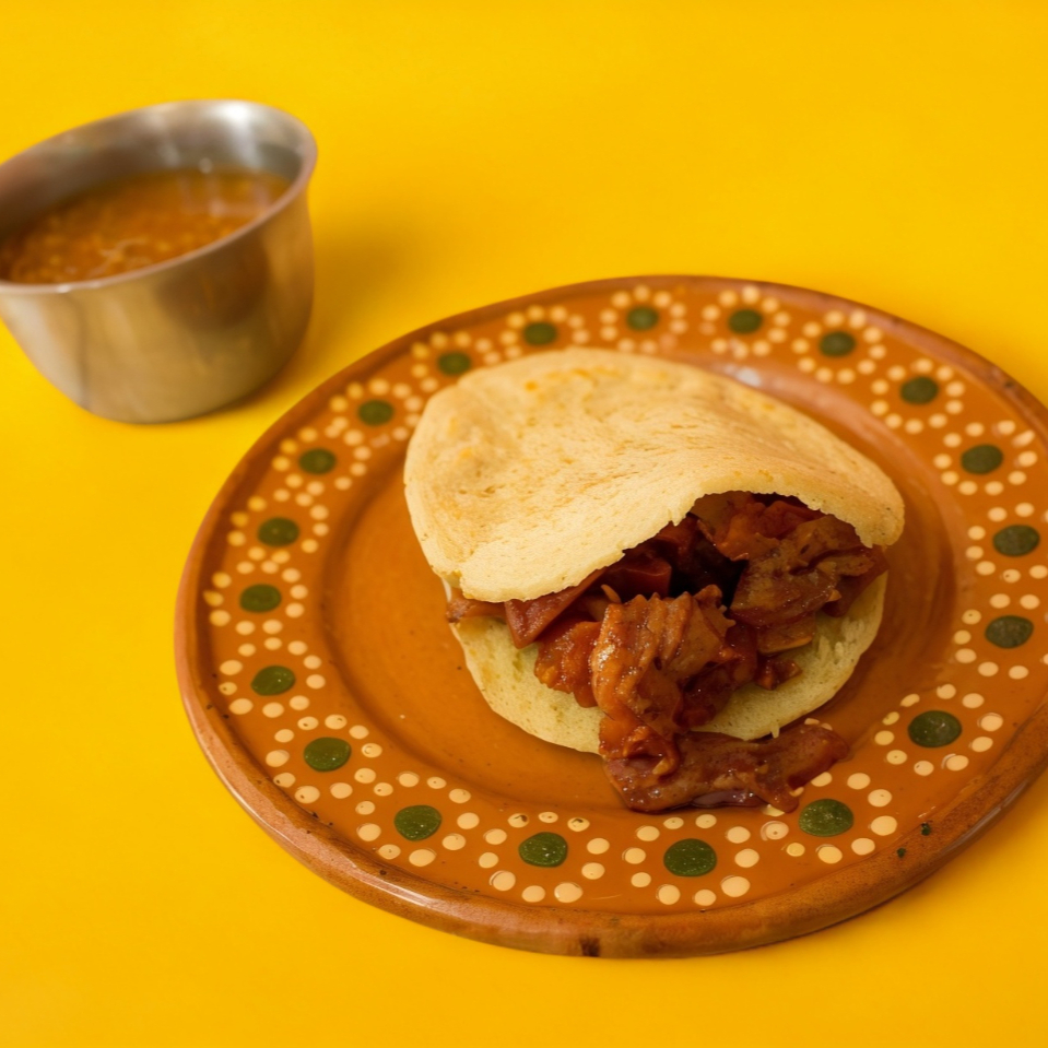 Gordita de chicharron prensado guisado en salsa roja