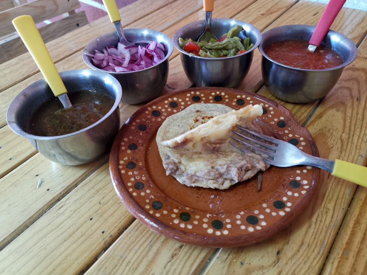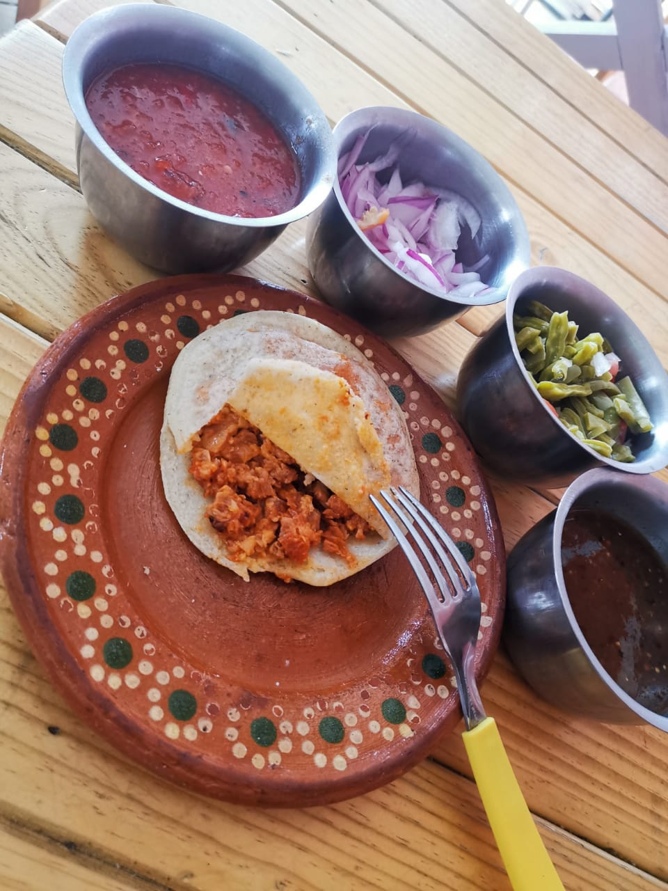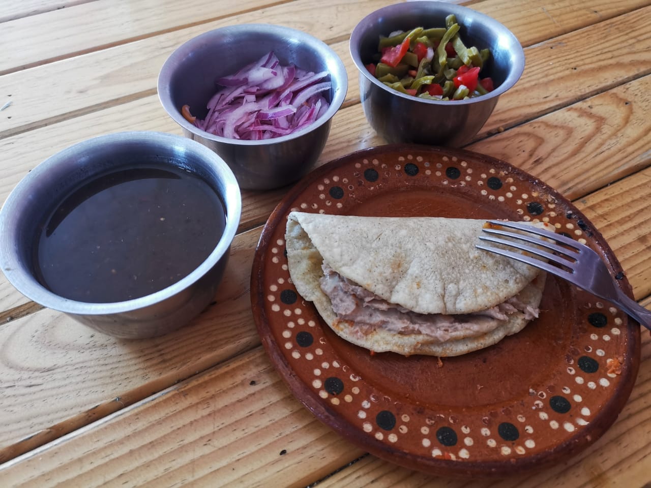 Salsa roja, base de frijol, guisado y queso.