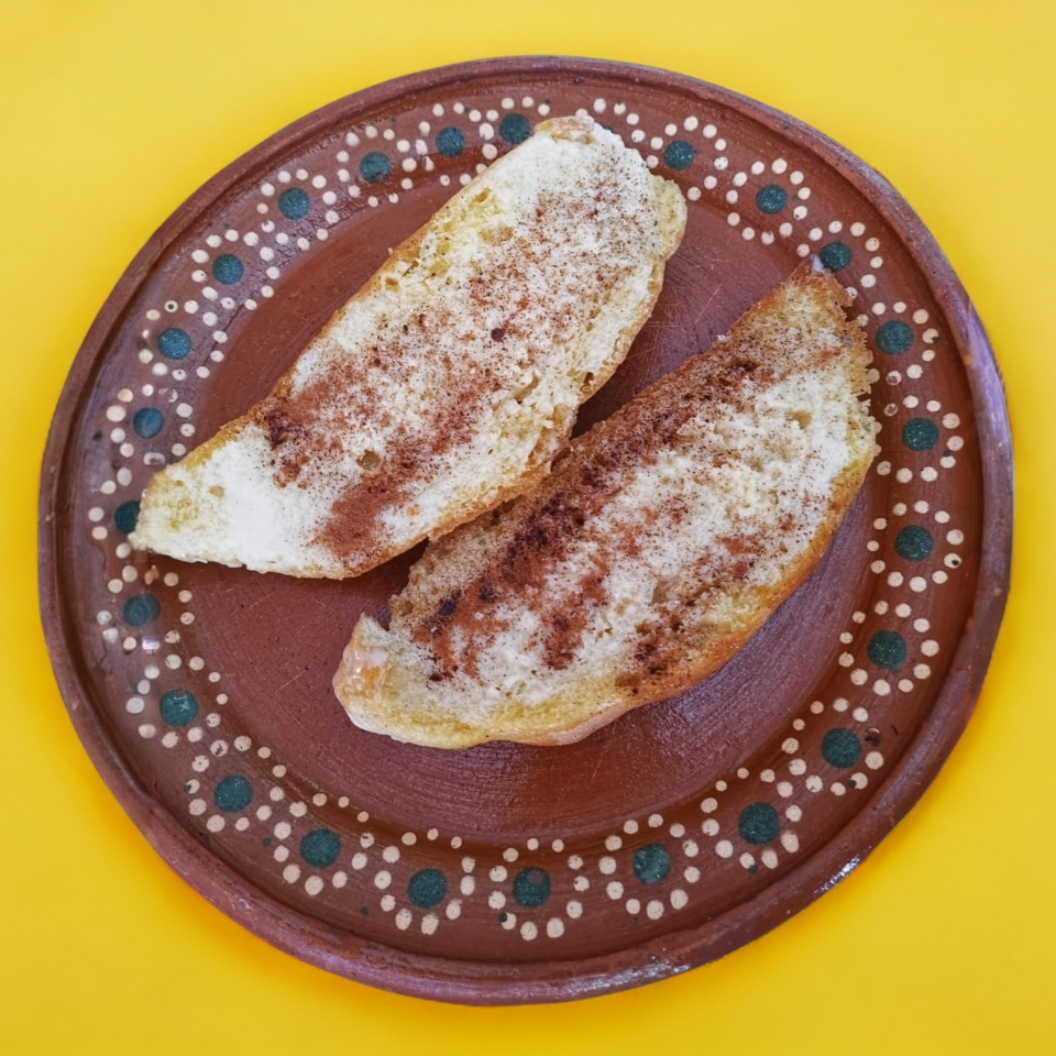 Mollete de mantequilla con lechera y canela (ambas partes del bolillo)