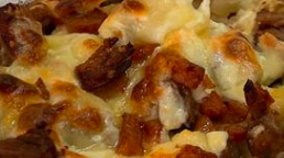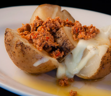 Papa,relleno,tocino ,mucho queso y mucha carne
