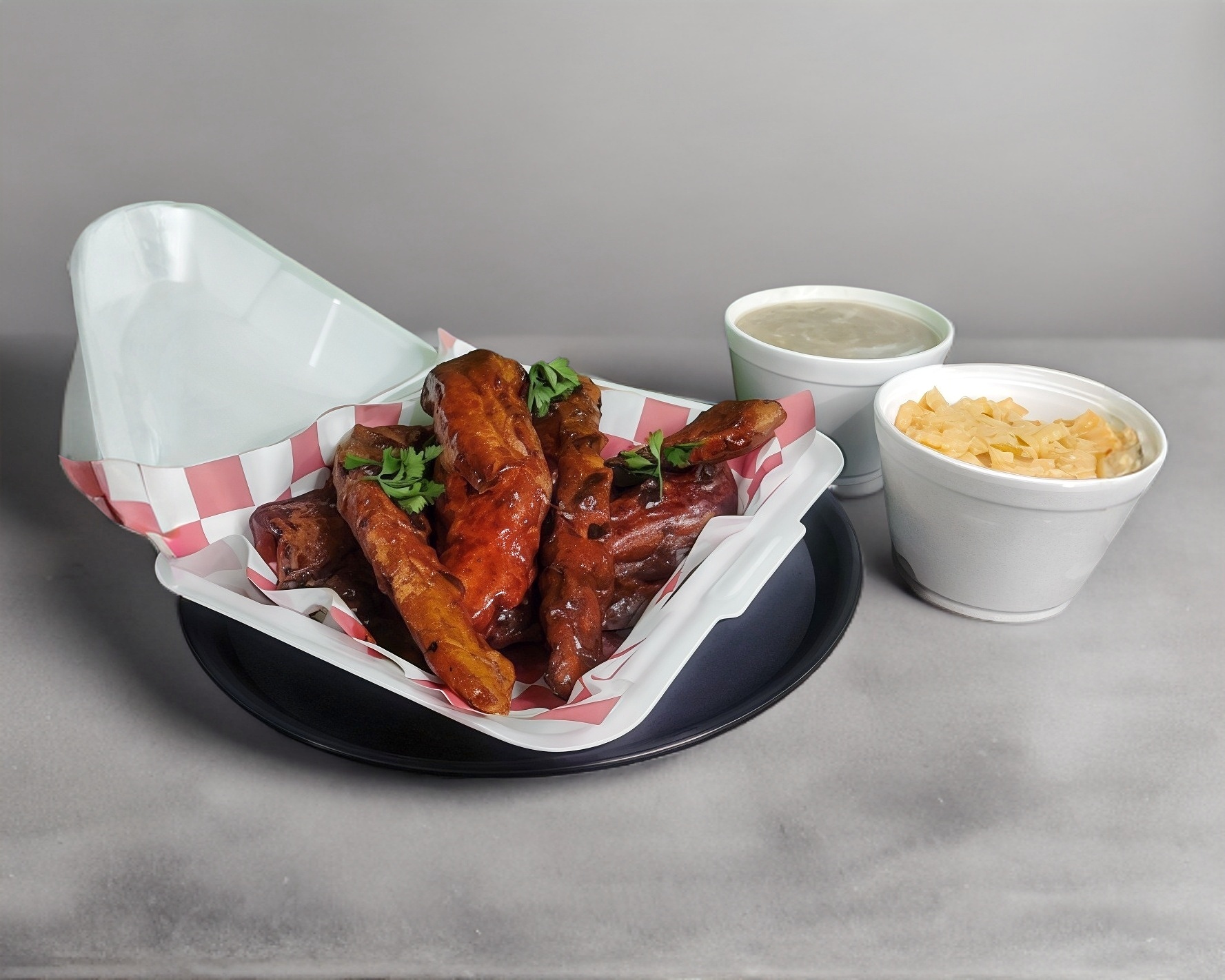 500 gramos de deliciosas tiras de costilla de cerdo adobadas y bañadas en la salsa de tu preferencia.