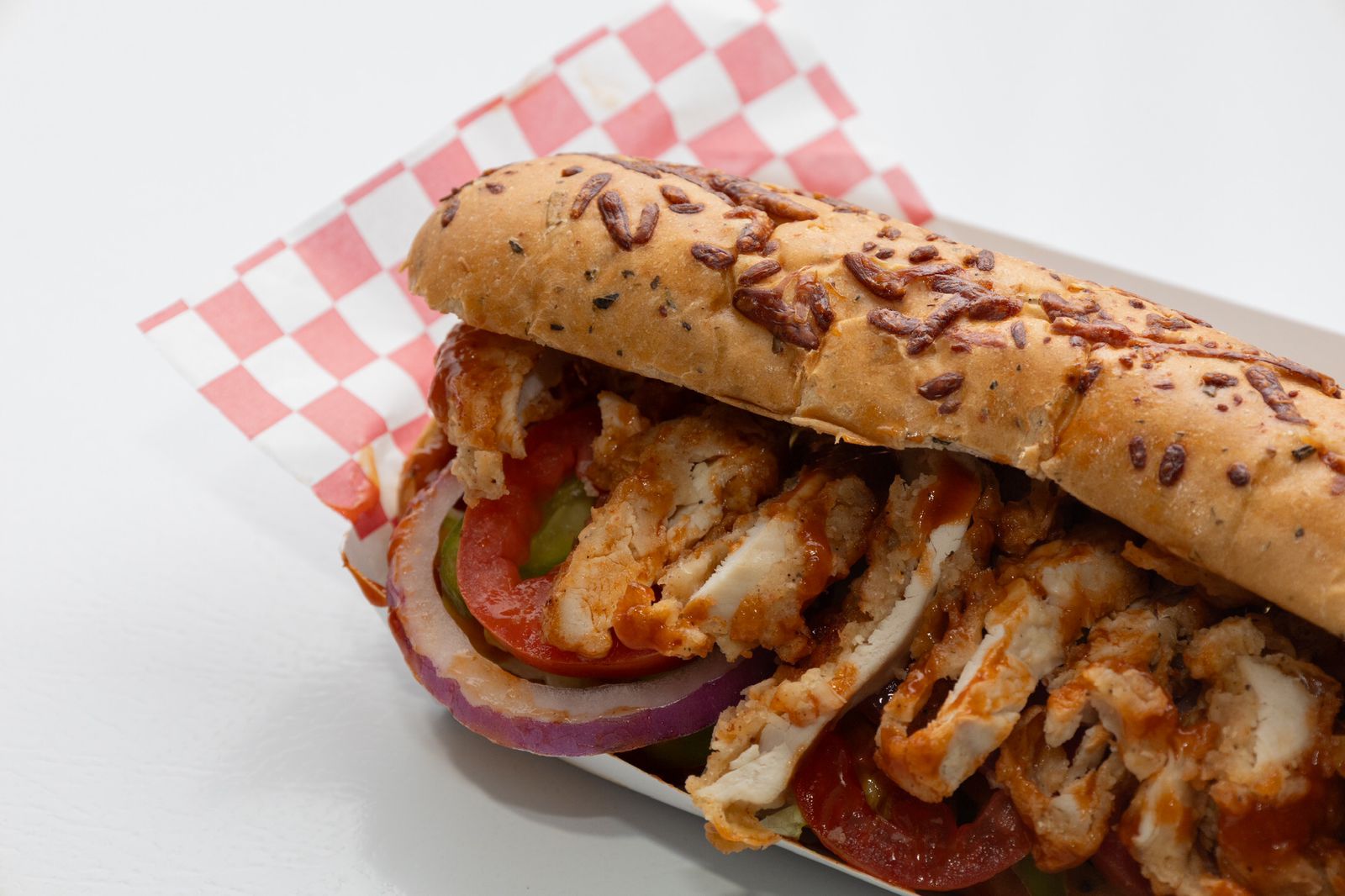 an baguete, pollo empanizado, lechuga, cebolla, pimiento, BBQ.