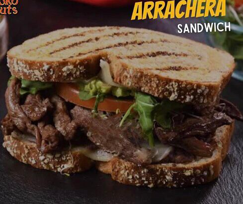 Pan integral, carne de arrachera, crema, mayonesa, cebolla morada, jitomate, pepino, lechuga.