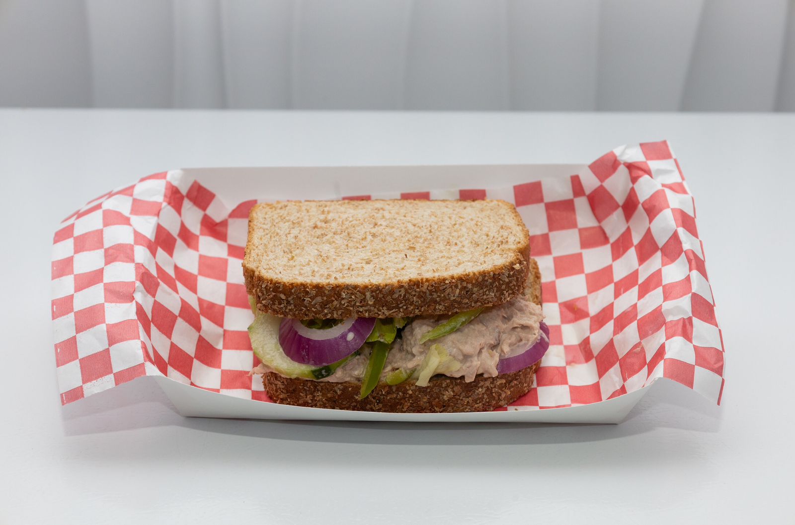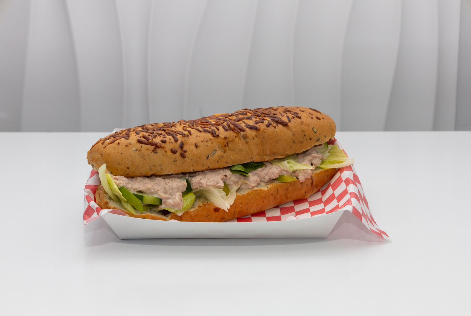 Pan baguette, atún, mayonesa, lechuga, cebolla, pepino, jitomate, zanahoria, pimiento morrón, ranch.