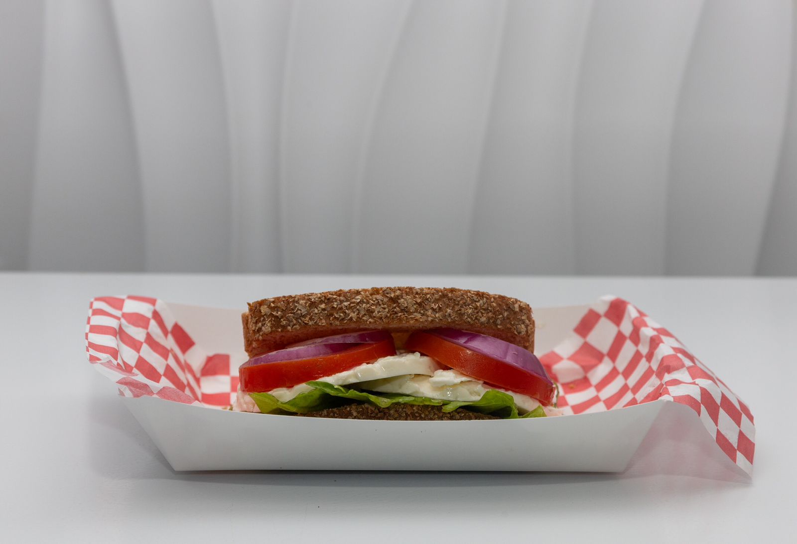 Pan integral, huevo estrellado, tocino, queso chedar, crema, mayonesa, cebolla morada, jitomate, pepino, lechuga.