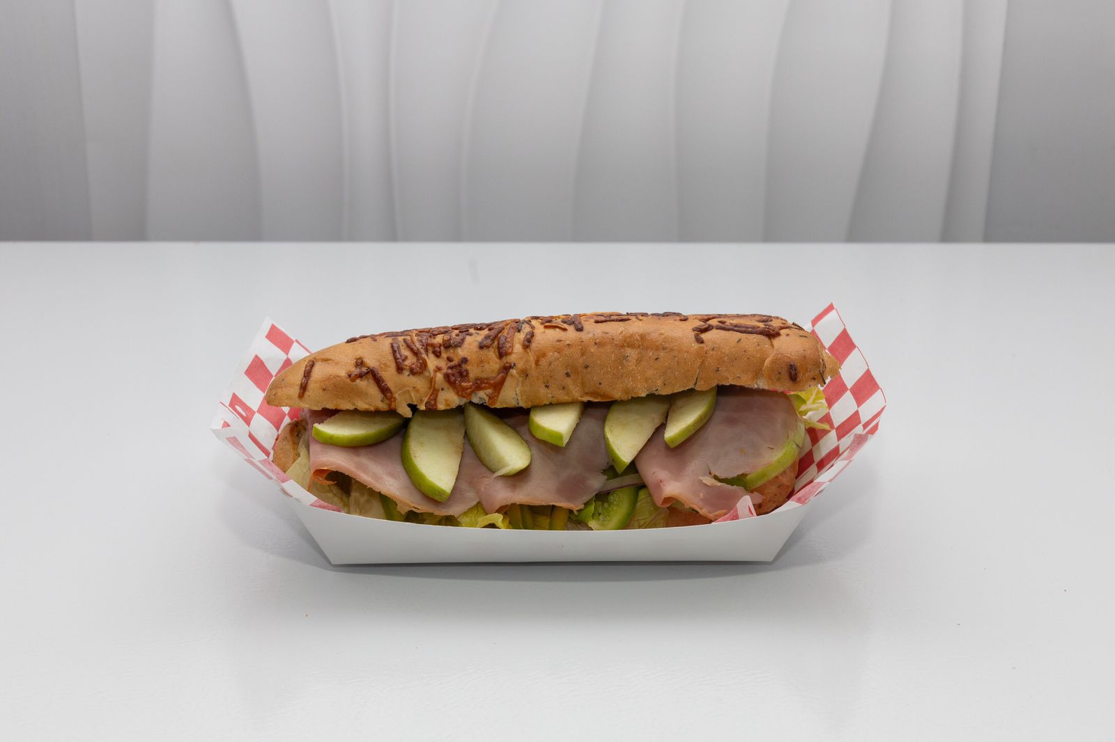 Pan baguette, lechuga, manzana, mozarela, pepino, pimiento morrón, ranch.