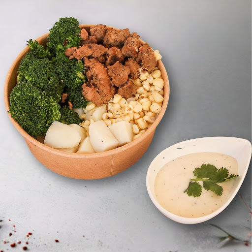 Delicioso bowl de arrachera marinada con papa, brócoli, elote, habas con sal y semillas de girasol. ¡Un festín de sabores!