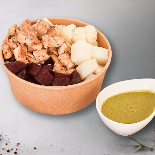 Bowl de pollo a la parrilla con papa, coliflor, betabel y habas con sal, acompañado de aderezo de cilantro limón. ¡Fresco y delicioso!