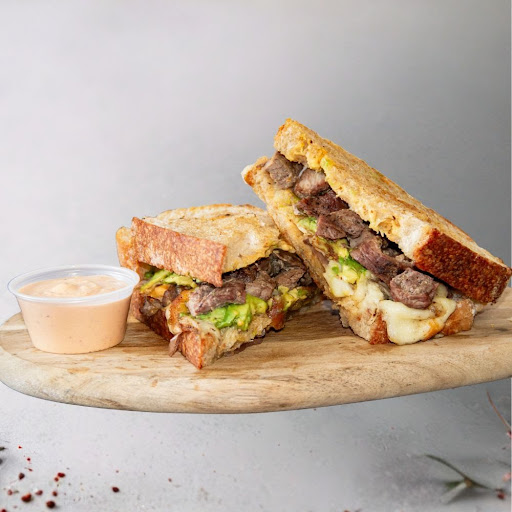 Toast de Arrachera. Carne suave, cebolla caramelizada, aguacate y queso fundido sobre pan toscano artesanal. Acompañado de chile tatemado.