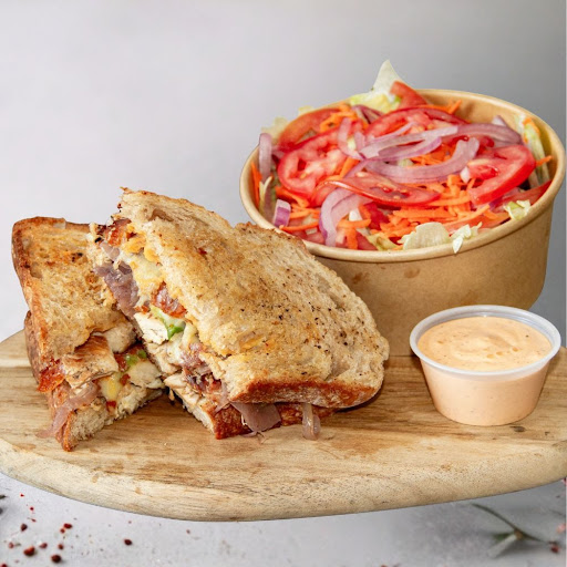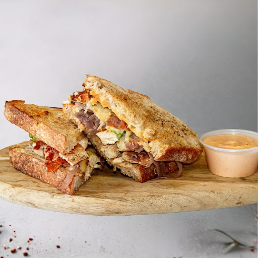 Toast de pollo sazonado, aguacate, aderezo de la casa, queso fundido en pan toscano, acompañado de aderezo de chile tatemado