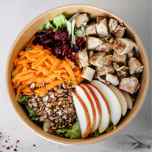 Ensalada con pollo a la plancha, lechuga, zanahoria rallada, nuez picada, arándanos, manzana roja y aderezo de frutos rojos.