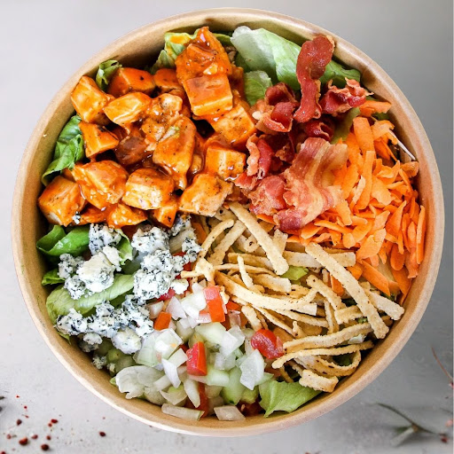 Ensalada de lechuga mixta con pollo en salsa buffalo, zanahoria, pico de gallo, tiras crujientes de tortilla, tocino y Blue Cheese Crumble