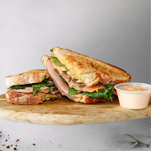 Toast de Pavo y Aguacate. Jamón de pavo, aguacate cremoso, espinaca y queso americano fundido en pan toscano. Opción ligera y nutritiva.