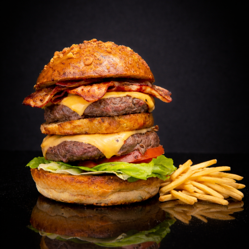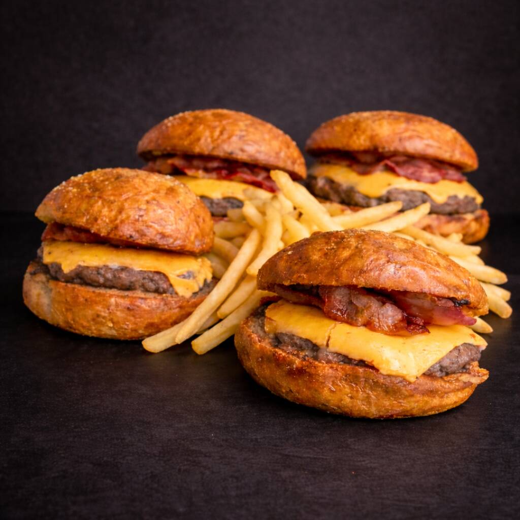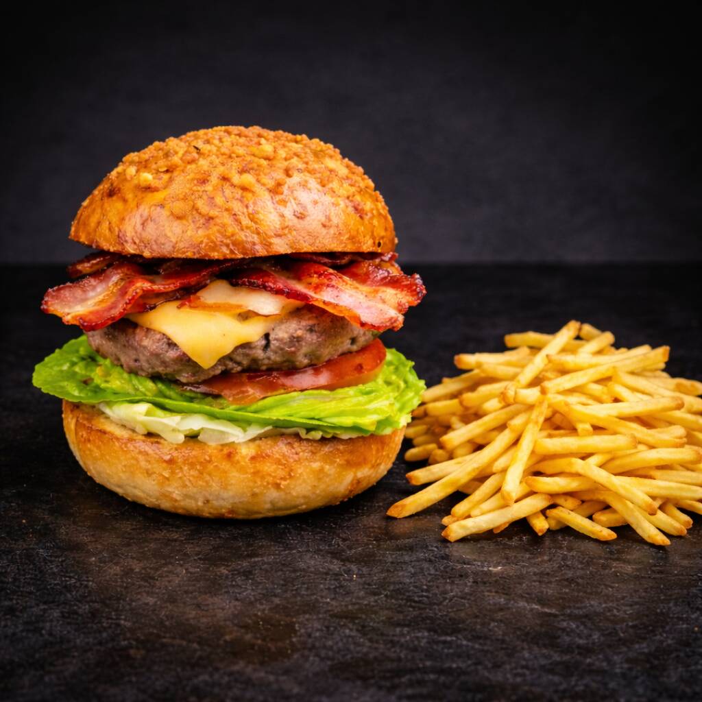 Hamburguesa de 130 gr de carne de res, tocino, y queso amarillo, lechuga y jitomate, acompañadas de chips camote y papa sazonada con pimienta limón.